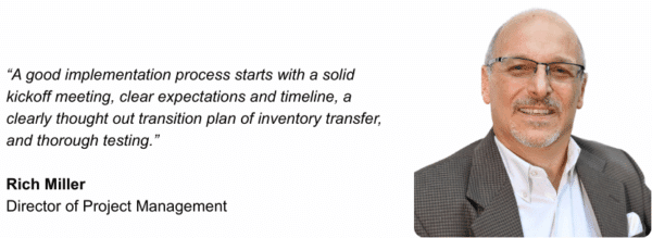 “A good implementation process starts with a solid kickoff meeting, clear expectations and timeline, a clearly thought out transition plan of inventory transfer, and thorough testing. Open, honest, and transparent communication is absolutely key,” says Rich Miller, Director of Project Management.