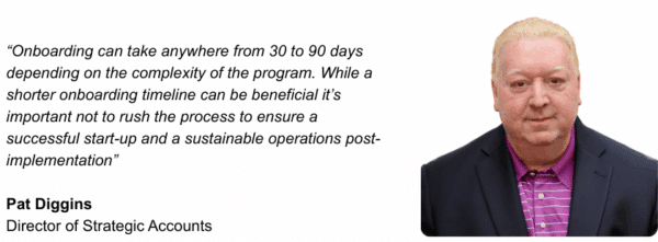 - Post-Implementation Review – After go-live we conduct a lessons learned meeting and share lessons learned during the transition to set the stage for a successful long-term partnership. “Onboarding can take anywhere from 30 to 90 days depending on the complexity of the program. While a shorter onboarding timeline can be beneficial it’s important not to rush the process to ensure a successful start-up and a sustainable operations post-implementation” Pat Diggins, Director of Strategic Accounts.